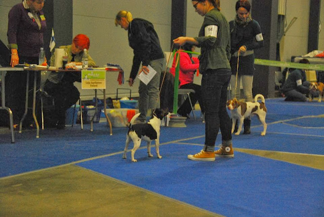 "2,5 v. Pienehkö, mittasuhteiltaan neliömäinen uros, jolla sopusuhtainen raajaluusto. Erinom. uroksen pää. Hyvä purenta, ilme, korvat. Vahva kaula. Hyvä karva, väritys voisi olla rungossa rikkonaisempi. Liikkuu reippaasti, mutta takakorkeana. Takaliikkeessä voisi olla enemmän voimaa. Saa miehistyä + reipastua."Sellainen arvostelu tällä kertaa, samalta tuomarilta kuin viimeksi. Oltiin mielestäni jo ihan kohtuullisen hyvin treenattu pöydällä olemista ja vieraiden ihmisten käpälöintiä ja oma oloni oli paljon varmempi kuin edellisellä kerralla, mutten osannut odottaa Konnan hermostuvan (arkapieruilevan) mitasta, tosin enpä ollut mitään vastaavaa sen kanssa harjoitellutkaan. Se oli pöydällä aluksi ihan ok, mutta mittaväline oli epäilyttävä ja sen jälkeen koko homma ei olisi enää kiinnostanut.